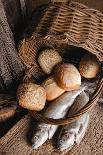 "Ao cair da tarde, vieram os discípulos a Jesus e lhe disseram: O lugar é deserto, e vai adiantada a hora; despede, pois, as multidões para que, indo pelas aldeias, comprem para si o que comer. Jesus, porém, lhes disse: Não precisam retirar-se; dai-lhes, vós mesmos, de comer. Mas eles responderam: Não temos aqui senão cinco pães e dois peixes. Então, ele disse: Trazei-mos. E, tendo mandado que a multidão se assentasse sobre a relva, tomando os cinco pães e os dois peixes, erguendo os olhos ao céu, os abençoou. Depois, tendo partido os pães, deu-os aos discípulos, e estes, às multidões. Todos comeram e se fartaram; e dos pedaços que sobejaram recolheram ainda doze cestos cheios. E os que comeram foram cerca de cinco mil homens, além de mulheres e crianças." (Mateus 14:15-21).
